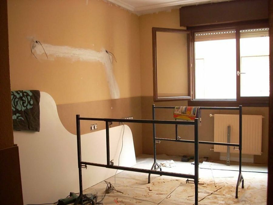 Aquí vemos ya los tableros presentados en la parte baja de la pared. Previamente hicieron el cajeado de los enchufes que servirían para el ordenador y también para colocar de nuevo el radiador bajo la ventana.
