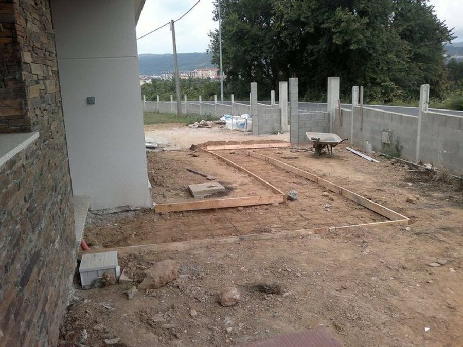 Esta época es la ocasión propicia para los proyectos de albañilería, por dos razones fundamentales: muchos planes, como el estanque, la barbacoa o el horno de leña, se vinculan a las gratas reuniones del verano, y el buen tiempo nos permite abordar trabajos en el exterior sin los inconvenientes de la lluvia y el frío. Otro montaje que un bricolega puede ejecutar por su cuenta, y sin necesitar siquiera la ayuda de un peón, es un sendero para tu jardín, pero no cualquier sendero, sino uno de hormigón (o concreto si le quieren decir así). Y como de costumbre lo asimilaremos viendo un magnífico ejemplo, la obra de nuestro amigo Salvacastro, completada con varios elementos decorativos en el estilo japonés tan actual. Es toda una maravilla! La panorámica del jardín recoge la fase previa, el encofrado. Salvacastro ha utilizado tablas, aseguradas firmemente con hierros clavados en el terreno. La capa de hormigón ejercerá un empuje muy considerable que debe contrarrestarse si no queremos un calamitoso derrumbe de la 'presa' con el desperdicio de tiempo y material.