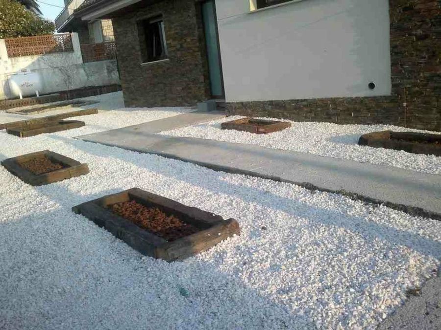 Las traviesas hacen un bello contraste de color y textura con la grava. Nuestro amigo las utilizará como jardineras.