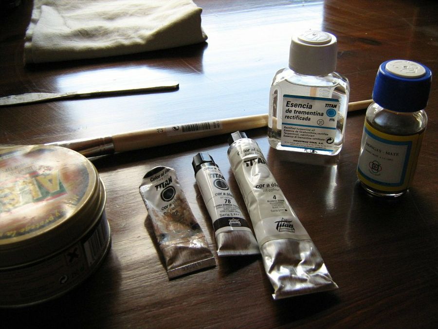 Llegamos al momento estelar del adorno, la pátina. Nuestra lectora nos ofrece amablemente su receta: “Un chorrito de óleo marrón, una pizca de óleo blanco y una pizca de óleo negro, mezclados con esencia de trementina. Añadimos un poco de barniz a la cera de Mongay, volvemos a mezclar bien y añadimos cera blanca, hasta dejar la sustancia bien espesa”. CristinaM aplica este producto artesanal en el marco del espejo y el tablero, cuidadosamente, con pincel en la misma dirección, y deja secar una semana.