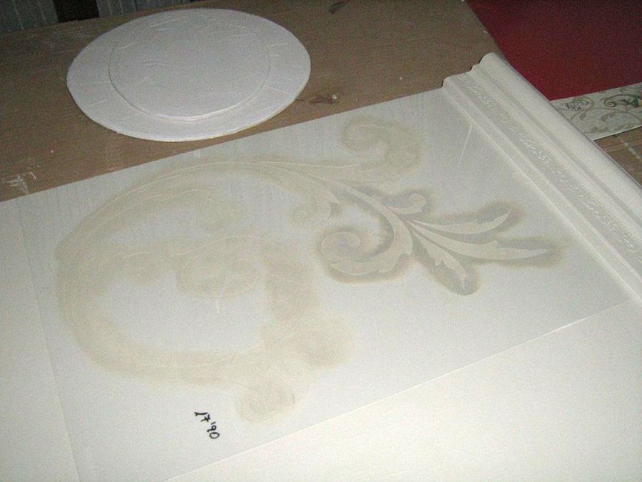 La plantilla que ha escogido CristinaM para el espejo es una de sus preferidas. “Me costó 17,90 euros, bastante carita, pero os aseguro que la tengo amortizada; se nota que es buena, queda ideal siempre que la he puesto”. Nuestra habilidosa forera siempre aborda con entusiasmo los trabajos de pintura, y para el color de base mezcla tres pigmentos: Lino, Organza y Kaolin. “Pongo un poquito de cada en una bandeja de plástico, y con un pincel de esponja voy untando a la vez en los tres, quito el exceso en un trozo de papel de periódico, y lo aplico en la plantilla, así aporta al dibujo varios tonos a la vez”.