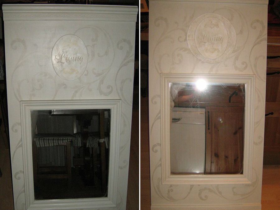Y una vez seca la pátina, hay que “armarse de santa paciencia” para lijar con lana de acero todo el conjunto. ¡El resultado compensa con creces! CristinaM nos enseña aquí las pruebas con dos adornos en la parte superior del espejo, se trata de figuras ovaladas de chapa, que la artista embelleció con pasta de estuco. “Usé una plantilla que pone Living, y un sello con tinta en las partes superior e inferior del texto”.