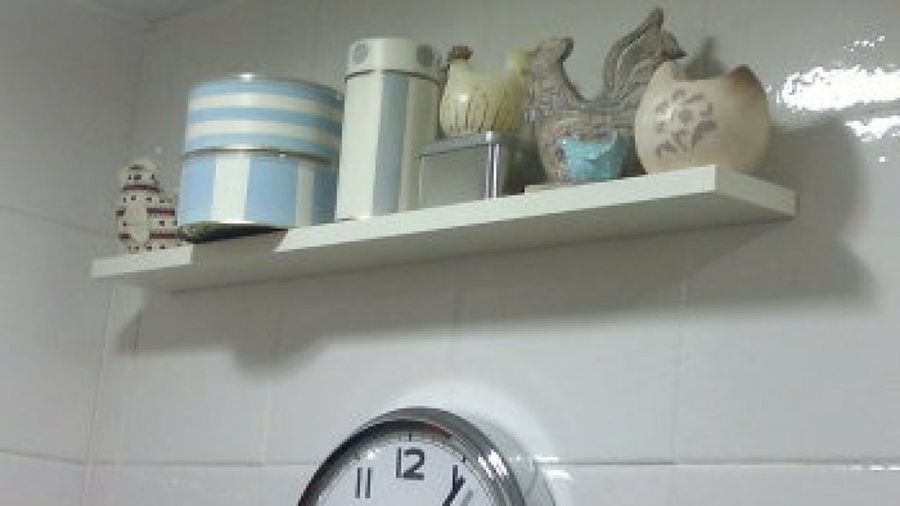 Lisa34 decoró un estante de su cocina con tres latas recicladas que recuperó con una imprimación y pintura azul que le había sobrado de pintar las paredes de la casa.