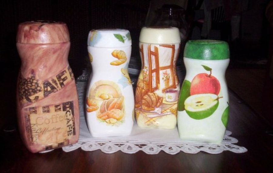 Por último, siguiendo la misma técnica, una capa de imprimación todoterreno y una decoración a base de decoupage, Aeschbe decidió reciclar, en esta ocasión, unos botes de cristal, y aquí tenéis el resultado.