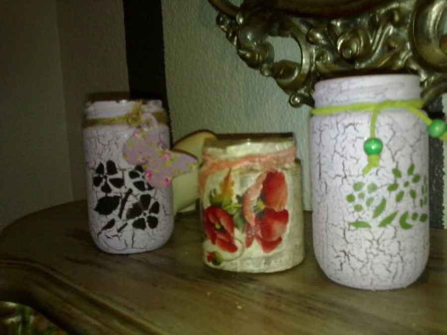 Lamismadeayer tampoco se ha quedado atrás y aquí vemos algunos ejemplos de sus trabajos, que vemos cómo los ha decorado con pintura plástica al agua y con técnicas como el craquelado o el decoupage.