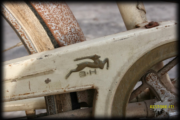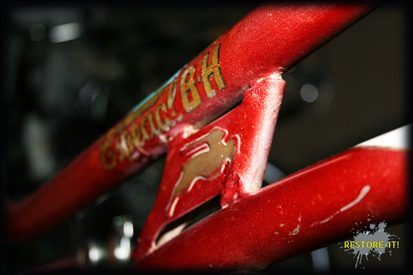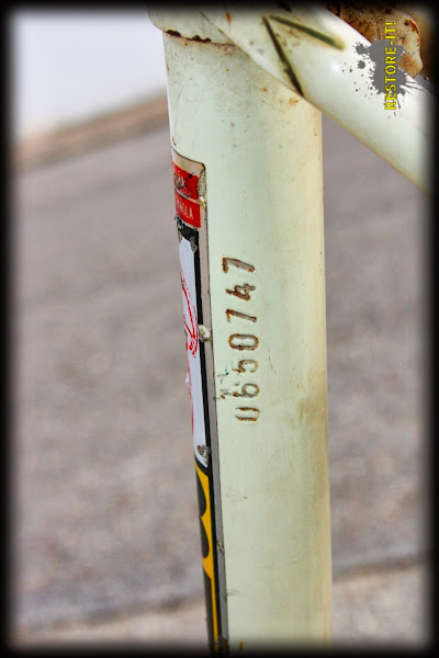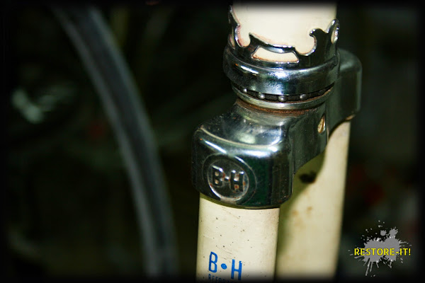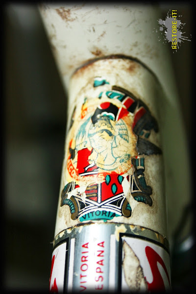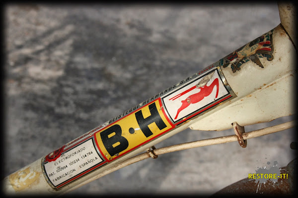 Mientras secaba el barniz, continuamos con la limpieza del cuadro cuando algo nos sorprendió muy gratamente. Un logotipo extraño figuraba debajo de una de las pegatinas de Bh, lo que hace más difícil todavía ubicar a esta bicicleta en el tiempo: