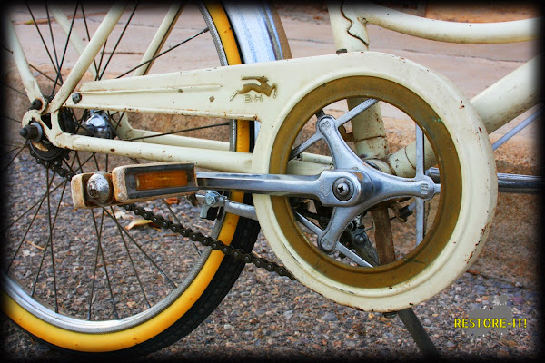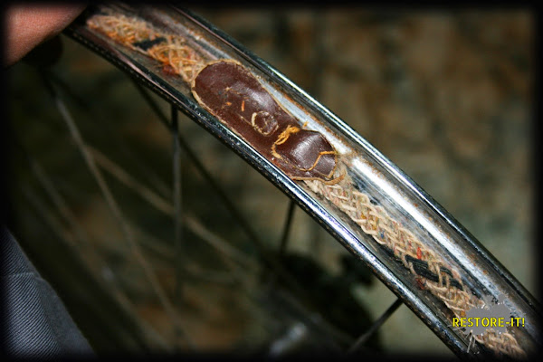 Curioso, verdad? Después de admirar este extraño distintivo, tocó seguir con lo nuestro y, después de la limpieza y pulido del cuadro, era el momento de montar los neumáticos nuevos de estilo vintage, seguro que le quedan perfectos: