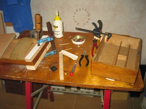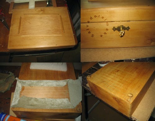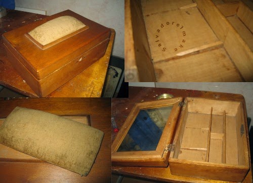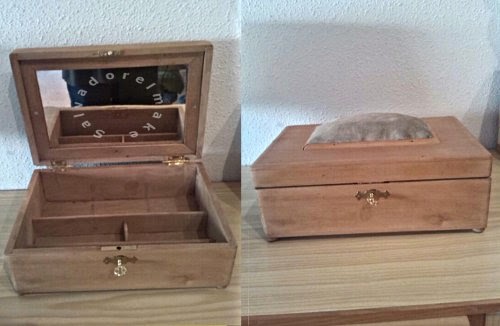 una vez limpias y reparadas una buena capa de protección anti-insectos y comenzamos el montaje de los diferentes elementos. Algunos, como los herrajes y la tela del alfiletero he tenido que ponerlos nuevos; afortunadamente en las tiendas de manualidades existen muchos modelos de bisagras y cerraduras que, si bien no son iguales a los originales, se asemejan bastante y quedan bien.