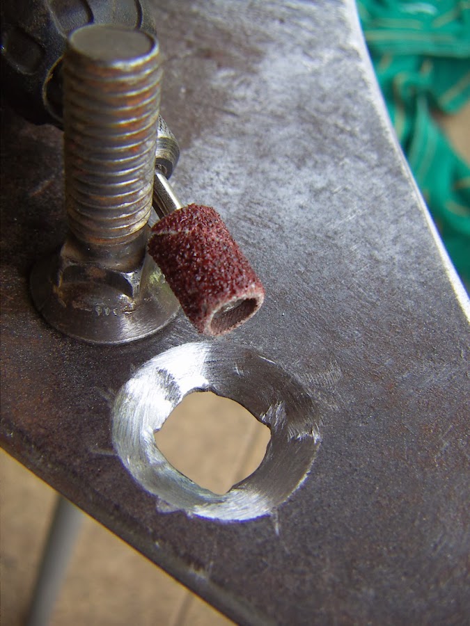 Después podemos usar un mini-taladro y hacer las cuatro muescas y luego , con una lija, repasamos el avellanado hasta que la cabeza del tornillo nos quede a ras con el resto porque el herrero...no se esmeró mucho....