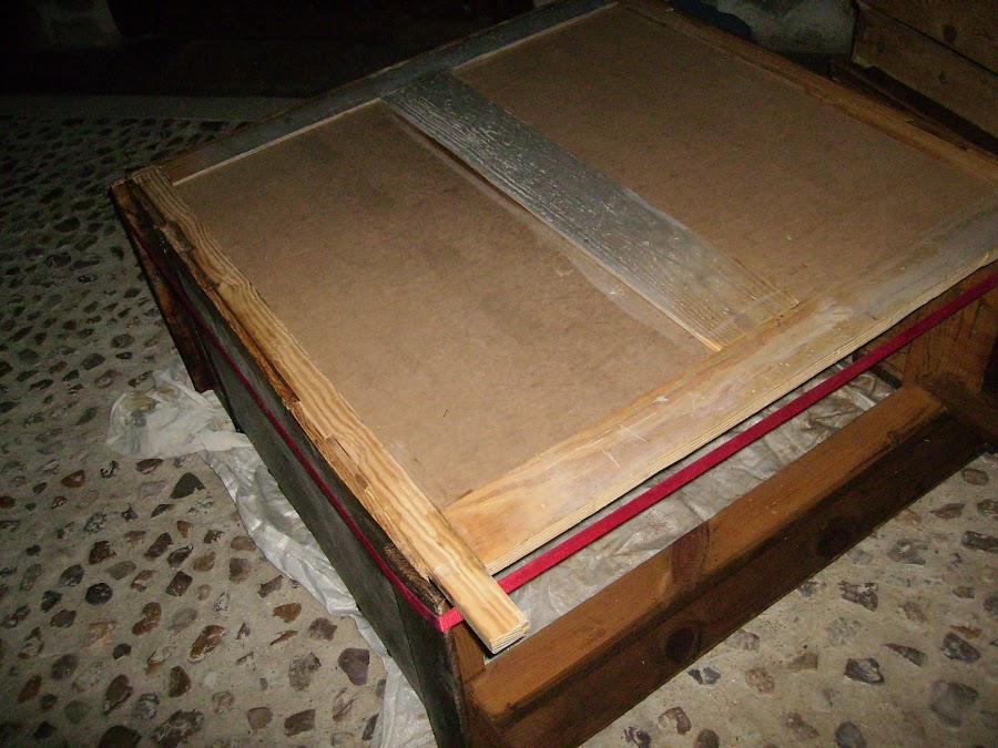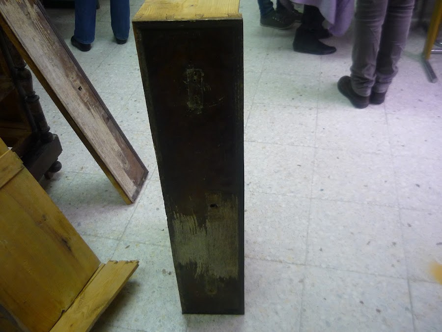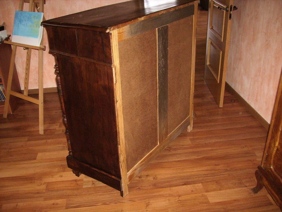 La parte trasera está aparentemente bien, no tenia nada más que lo que se ve. Pero esas tablas estaban muy carcomidas. Curiosamente las demás partes de la cómoda no presenta tener ni un sólo agujero de carcoma.