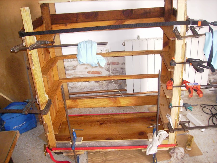 Las maderas que añada las encolo a los laterales, y fijo con gatos. Con un listón consigo el nivel para igualar la altura de todas las patas. Se ve en la foto como mido el nivel.