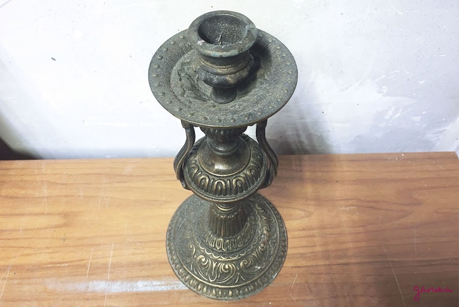 Como verás el metal del candelabro estaba oxidado, el barniz muy envejecido y tenía restos de cera de haberse usado.