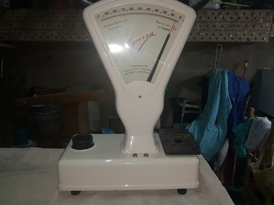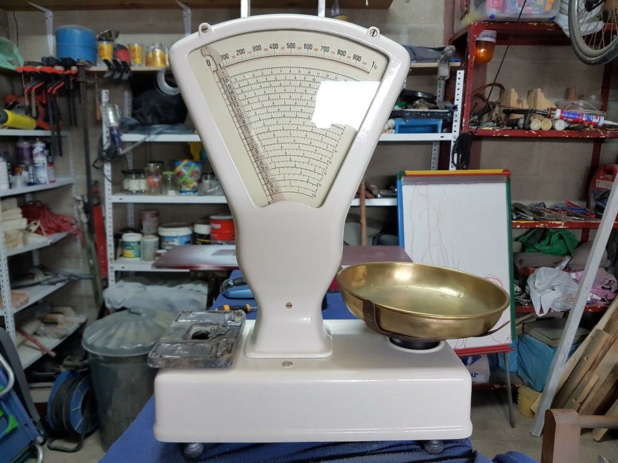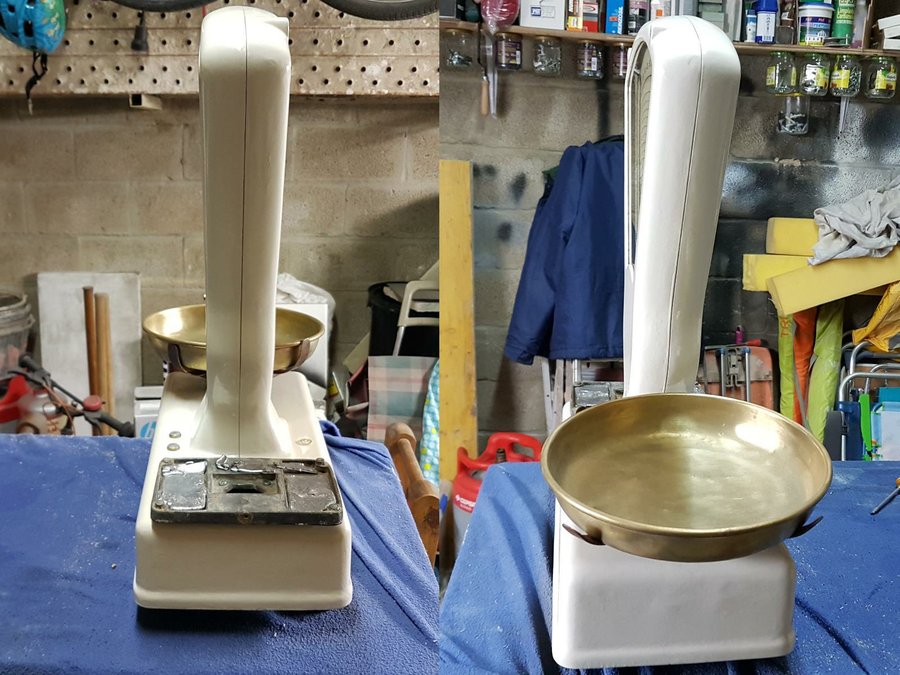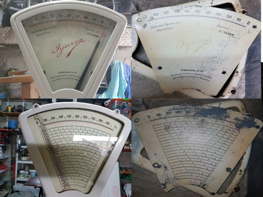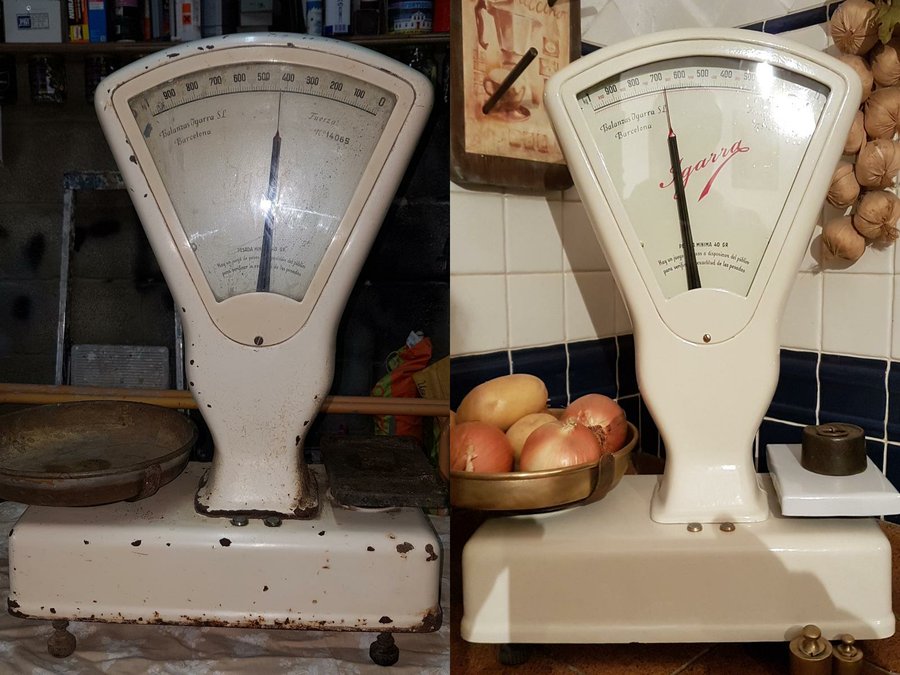 Antes y despues. En la foto del despues se puede apreciar el platillo para las pesas, cuando la recogi no lo traia, lo hice con chapa de aluminio, marque el tamaño del plato que va debajo y le di dos centimetros mas por cada lado, luego hice cortes en las esquinas para poder doblarlas y conseguir la forma deseada, y una vez hecho esto, los huecos que quedaron los rellelen con masilla de las que se utuliza en chapa de vehiculos. Un par de manos de pintura blanca y listo.