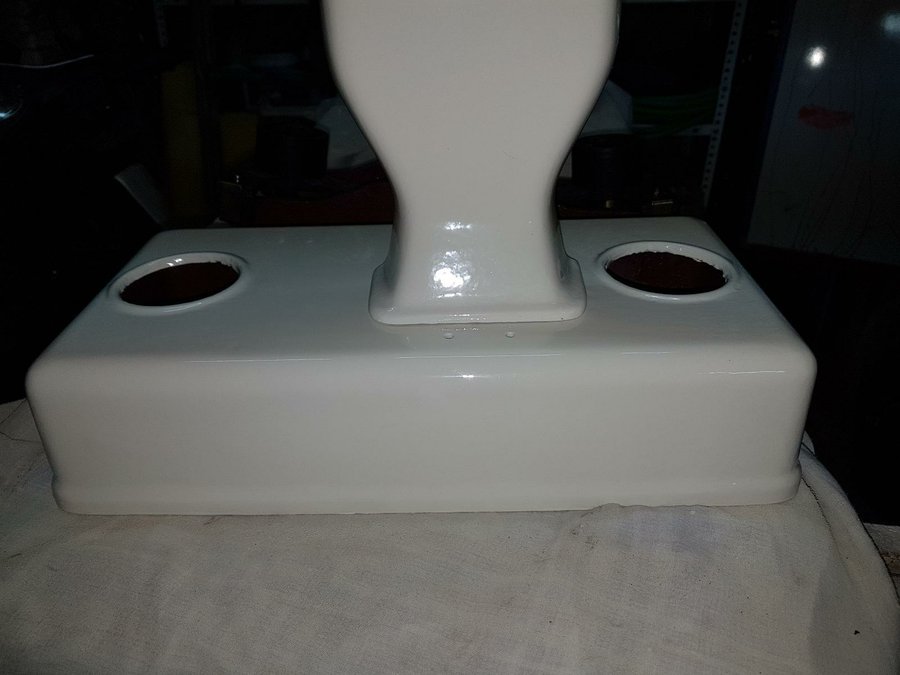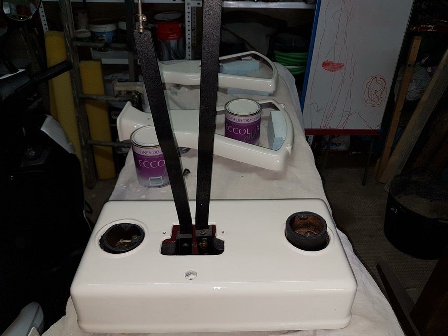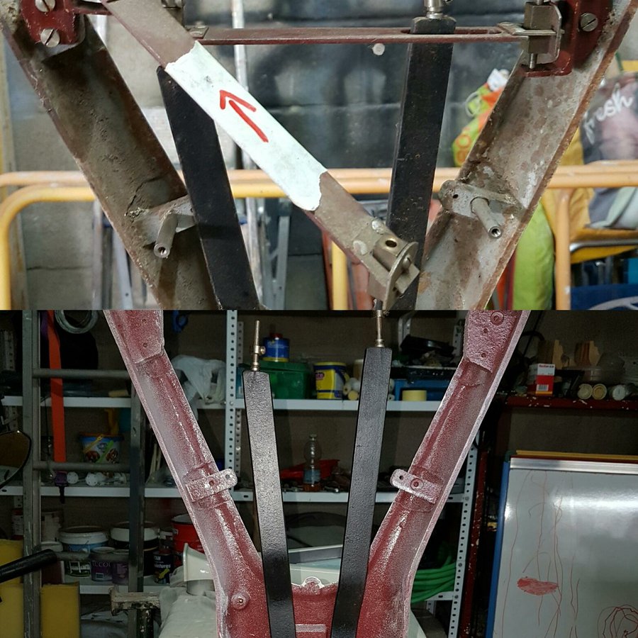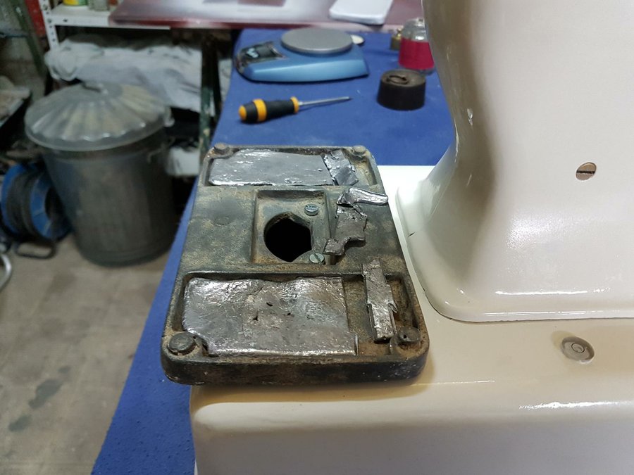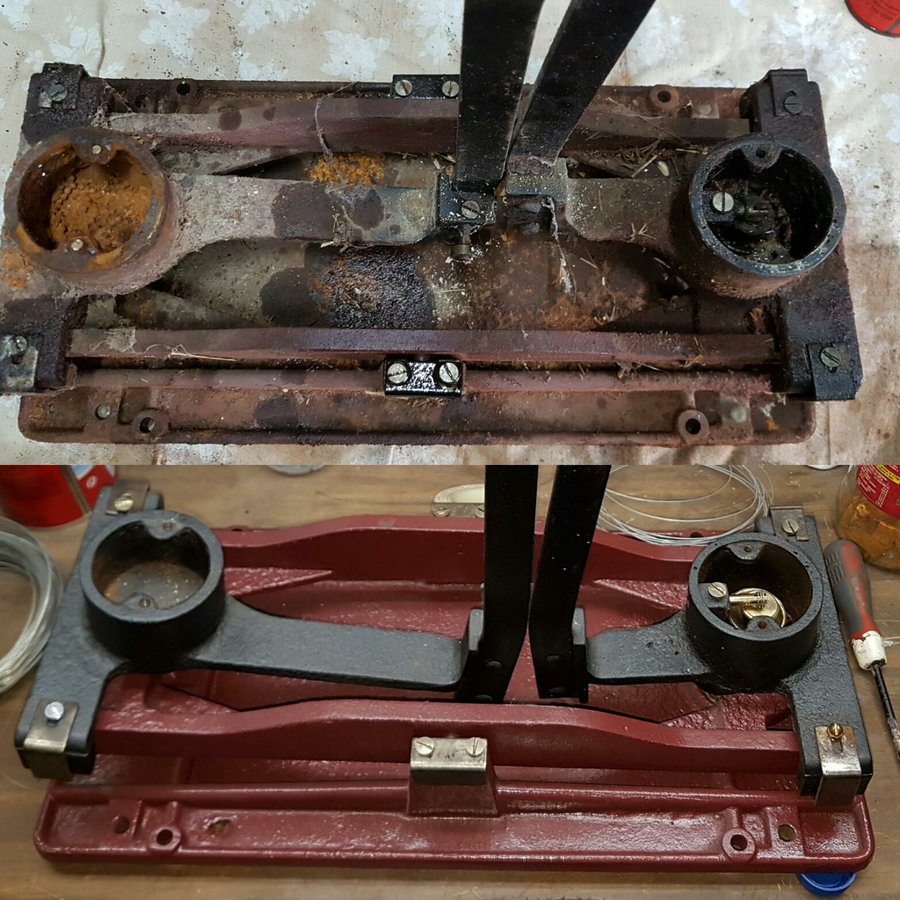 Antes y despues. En la foto del despues se puede apreciar el platillo para las pesas, cuando la recogi no lo traia, lo hice con chapa de aluminio, marque el tamaño del plato que va debajo y le di dos centimetros mas por cada lado, luego hice cortes en las esquinas para poder doblarlas y conseguir la forma deseada, y una vez hecho esto, los huecos que quedaron los rellelen con masilla de las que se utuliza en chapa de vehiculos. Un par de manos de pintura blanca y listo.