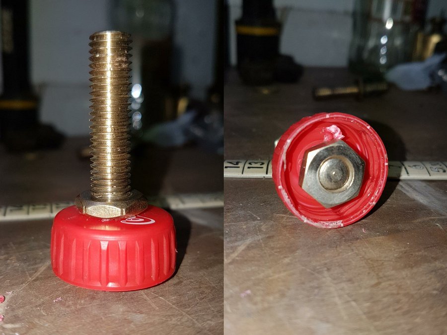 Esta son dos de las patas que tuve que hacer, ya que al quitarlas se me rompieron y no las pude recuperar. Estan hechas con el mismo tornillo original que traian pero con dos tapones de refresco de cola, luego un poco de pintura negra mate y perfectas. La verdad que mirandolas ahora que ya estan puestas nadie diria que estan hechas con tapones de refesco.