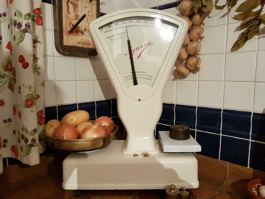 Y aqui el resultado final despues de mucho trabajo de lijar, pintar, repintar, relijar, mucha paciencia con las pegatinas de los numeros donde marcan los pesos y muchos quebraderos de cabeza para conseguir el equilibrio entre un lado y otro de la bascula a la hora de pesar y marcar lo mas exacto posible.