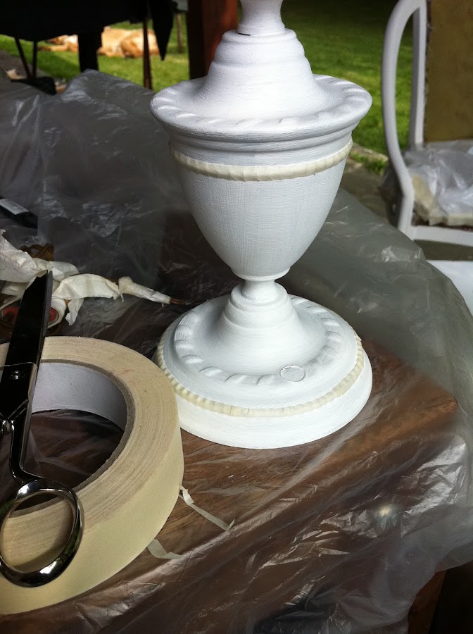 Retiramos la cinta adhesiva (una vez seca la pintura) y desgastamos un poco los detalles en blanco con una lija suave.