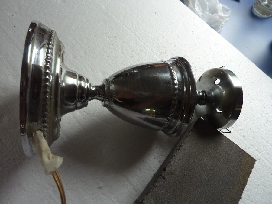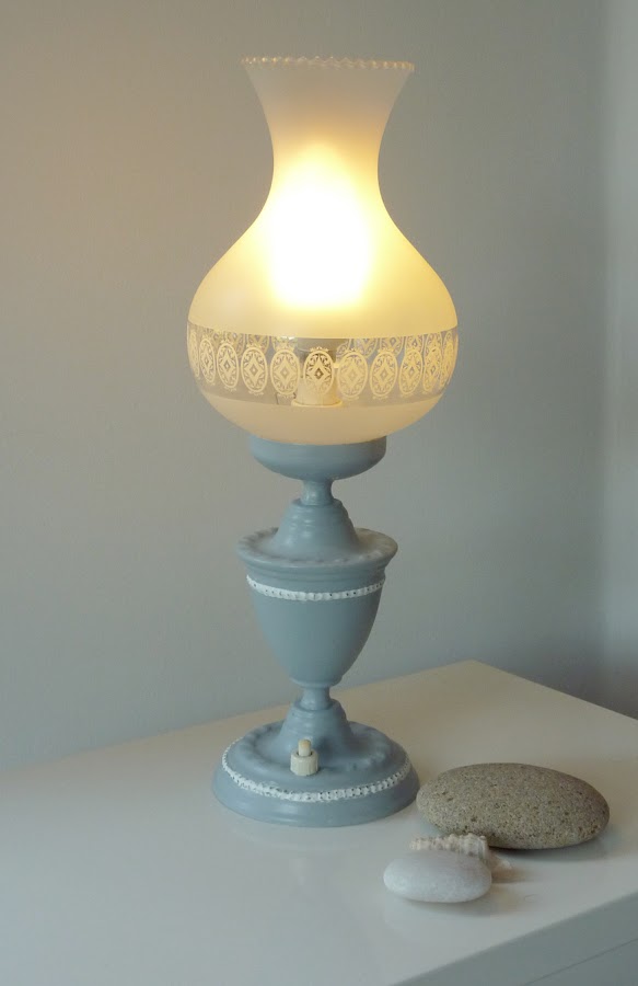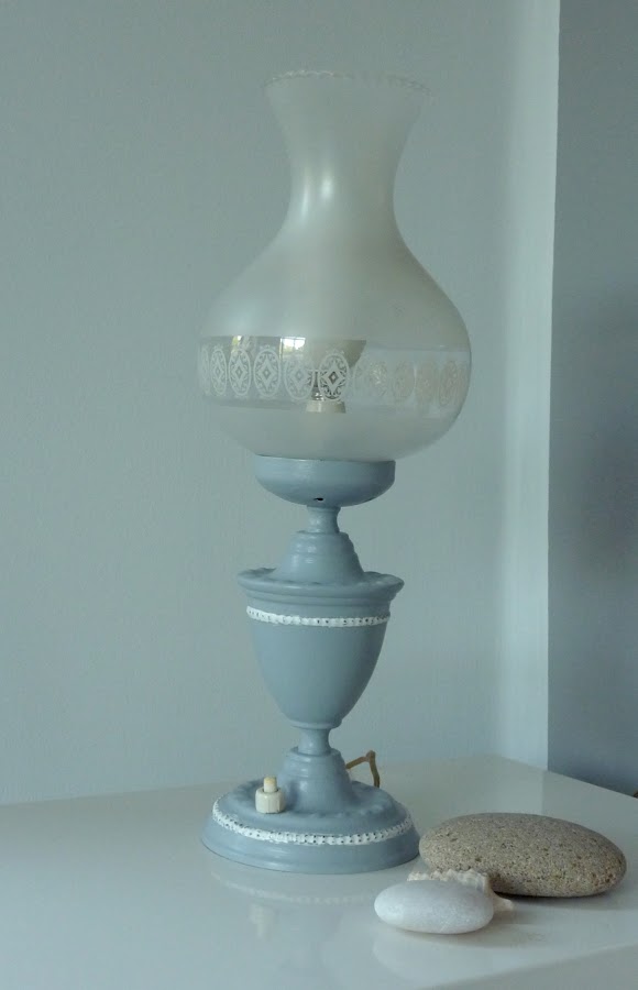 La vimos un domingo mientras recorríamos un mercadillo de segunda mano en busca de tesoros y nos gustó mucho. Es muy estilizada y elegante y la tulipa de cristal estaba en perfecto estado así que nos la llevamos (tras un breve regateo...jeje).