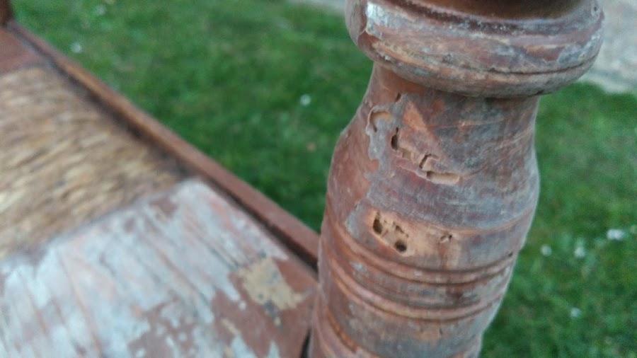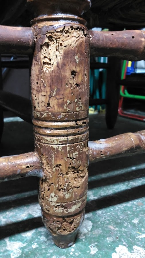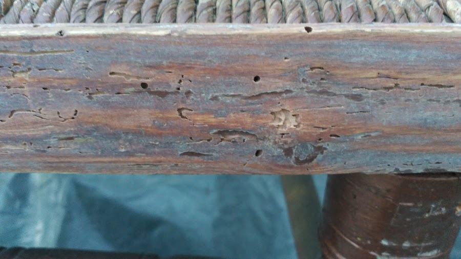 Ya se veía que estaba atacado por carcoma, pero la sorpresa fue al levantar las capas de pintura... Parecía una esponja en algunas zonas de tantos orificios y hubo que reconstruirlas.