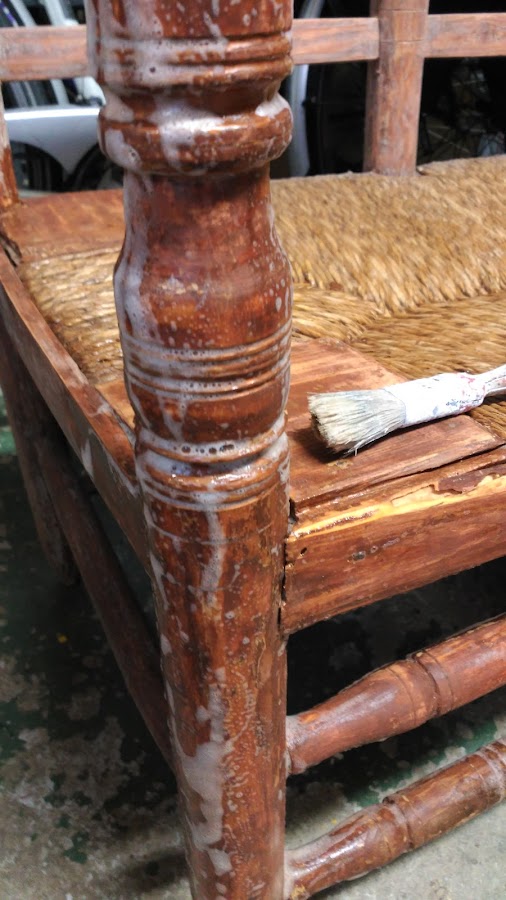 Una vez quitadas las capas de esmalte, le di como cinco capas de tratamiento fungicida a todo el banco(que lo absorbió como una esponja).