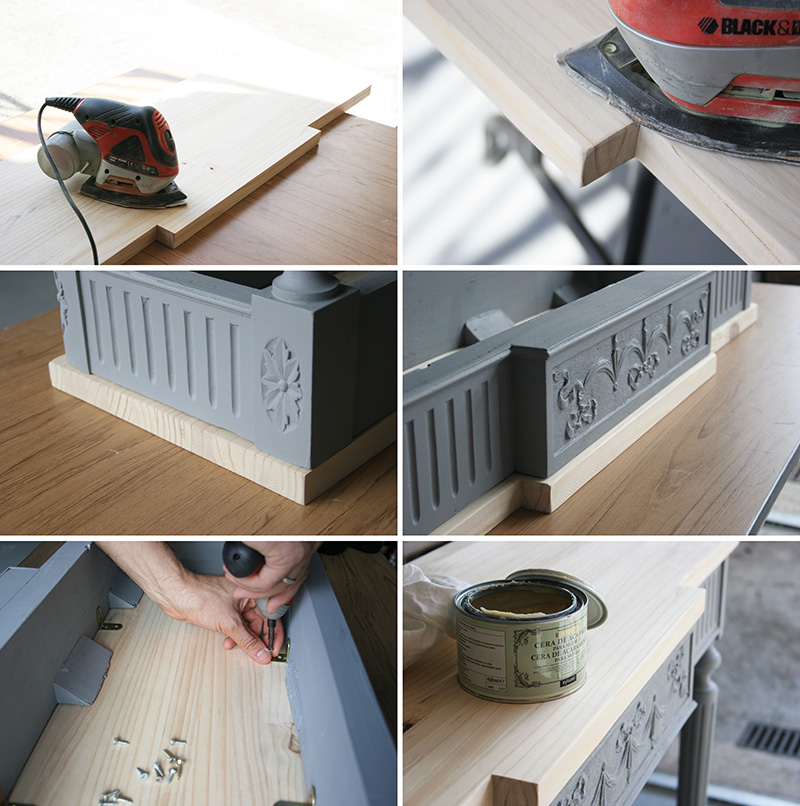 Herramientas: Lijadora, caladora, destornillador y trapo para limpiarlo y aplicar la cera