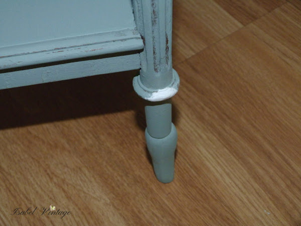 El color lo tuve claro desde el principio: el Gris Kioto de la chalk paint La Pajarita, un gris verdoso muy bonito al que yo hubiera llamado más bien "Verde Vintage"... ya sabéis que esto de los nombres de las pinturas es un caso. En los relieves y los surcos de las patas, pinté casi a pincel seco.