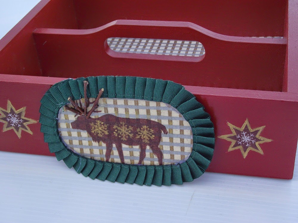 El procedimiento es sencillo: como pensaba pintarlo primero le di una mano de tapaporos y lija suavecita para cerrar el poro de la madera y protegerla de futuras manchas; dos manos de pintura rojo inglés de Hidralux, lijando muy suavemente entre cada una y para finalizar una mano generosa de Alkil. El interior lo he forrado con un papel precioso de Pinacam manualidades y con un resto de ese mismo papel he hecho el óvalo para el reno.