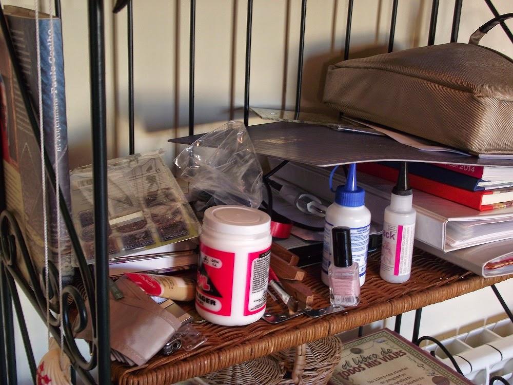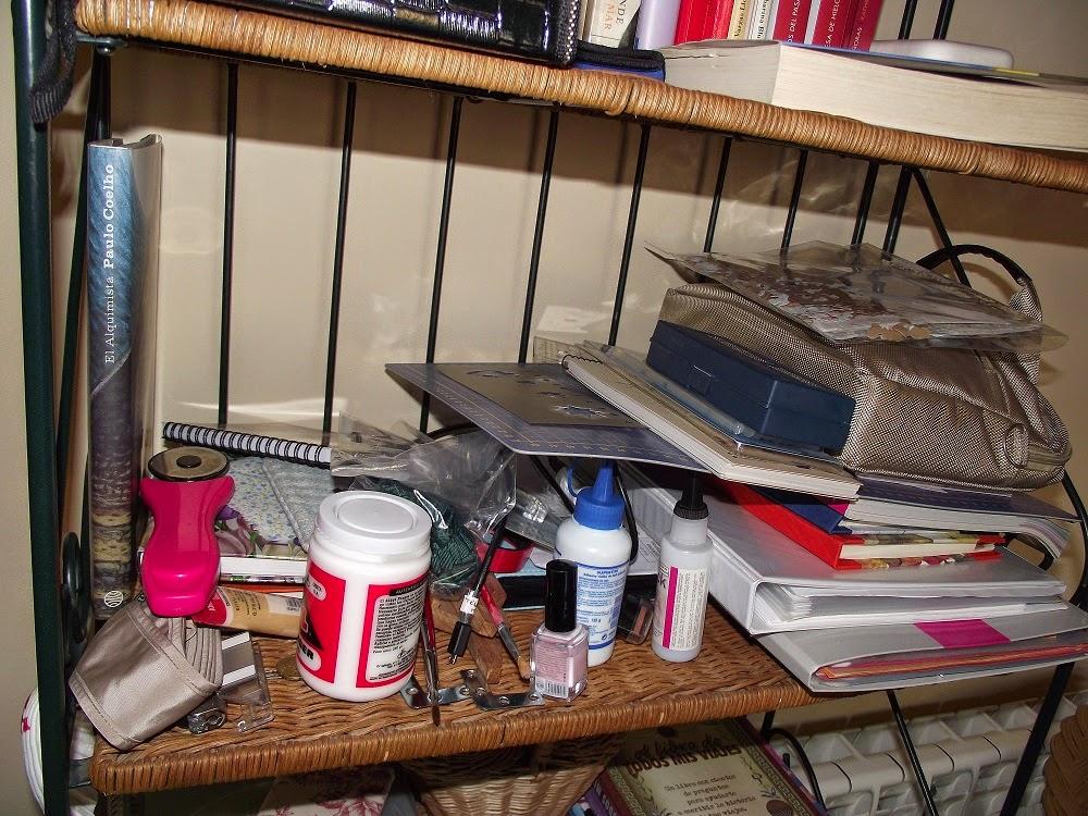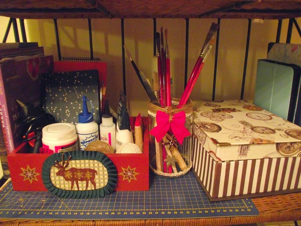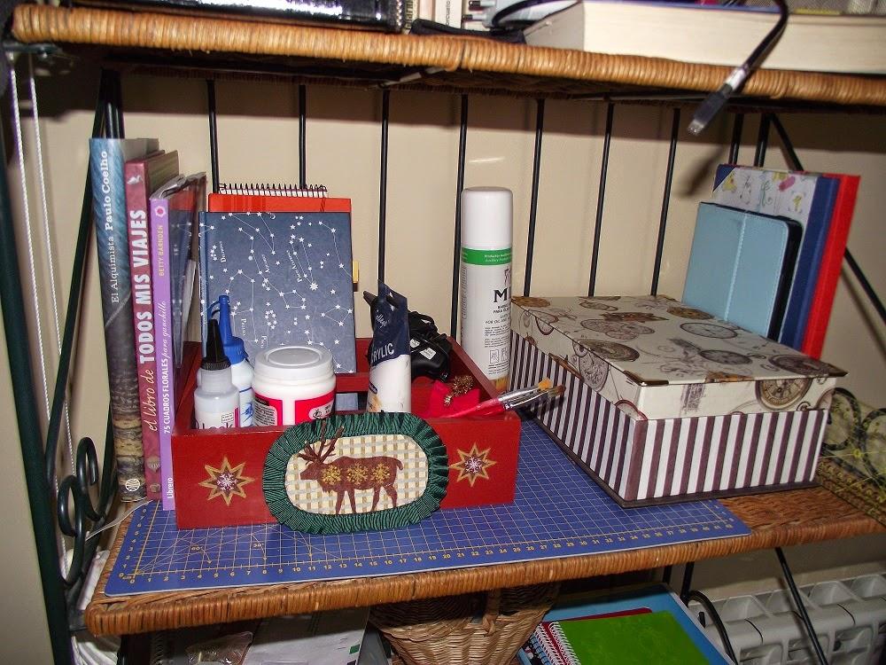 Antes de nada os voy a enseñar un rincón de la librería en el que tengo los materiales de manualidades que puedo utilizar en casa (el grueso de pinturas y demás lo tengo en el taller, pero siempre me gusta quedar algunas cosinas en casa para enredos como éstos):