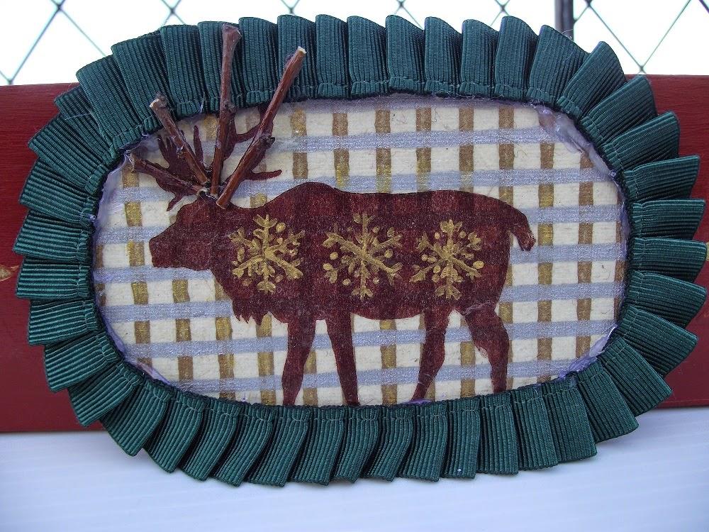 El reno y las estrellas las recorté de una servilleta de la Diy Show (en este caso ni siquiera es comprada, me la dieron con una botellita de agua que compré). Algunos retoques con pintura dorada, que para eso es adorno navideño; los cuernos del reno un poco más realistas con palitos del parque; lazos rojos y más dorado y... voilà, así ha quedado: