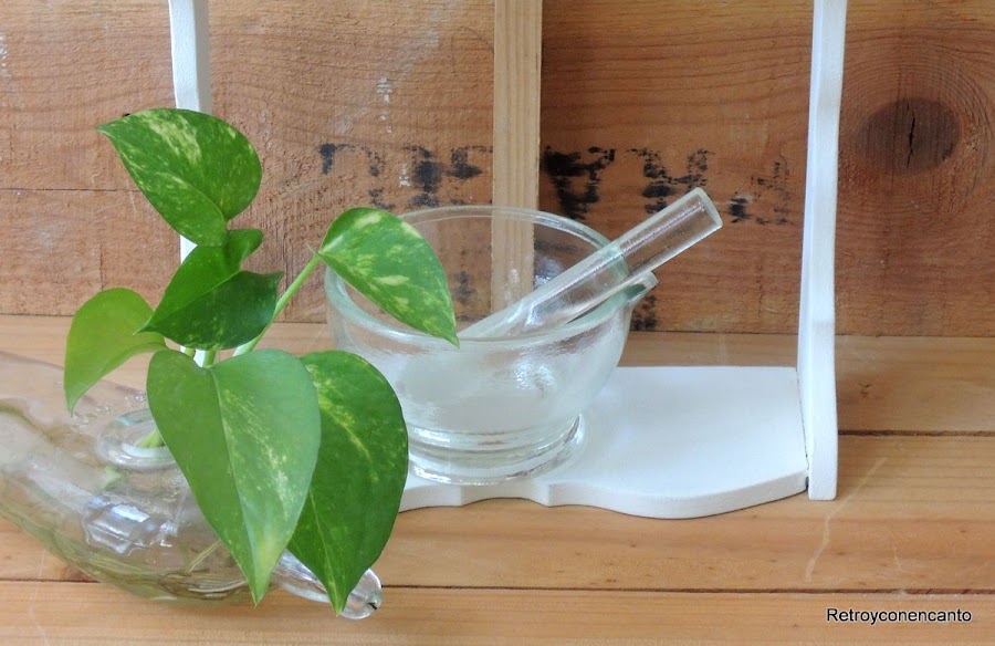 Pues aquí os contamos el porqué de esa casualidad. Desde que conseguimos este auxiliar, decidimos que iba a lucir nuestra colección de botes de laboratorio. ¡Y qué mejor fondo que la madera que nos trajo Julián!