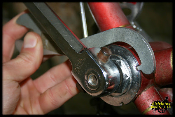 Como en los rodamientos de dirección, aquí también nos encontramos con una contratuerca aunque en este caso algo más compleja. Para poder soltarla necesitaremos una llave muy similar a la que se usa para fijar el Lockring de las bicicletas fixie: