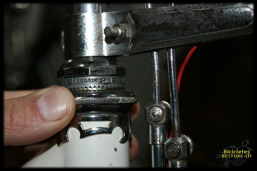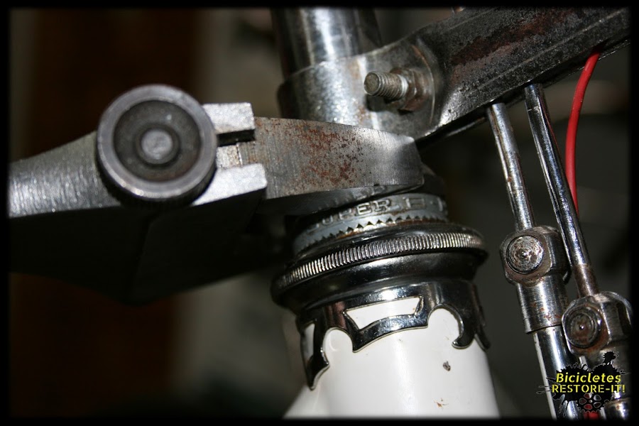 Una vez la tuerca inferior gire libremente, con la mano debemos enroscarla hasta que eliminemos la holgura existente pero, sin apretar a tope, ya que de hacerlo aprisionaríamos los rodamientos y éstos no girarían: