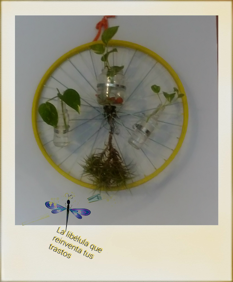 Me encontré esta rueda de bici, y la guardé pensando en que en algún momento se me encendería la bombilla de lo que hacer con ella. Y ese momento llegó cuando vi unos potos o photos en agua, me encantaron! Y entonces fue cuando ideé utilizar esa rueda como soporte para un jardín vertical.