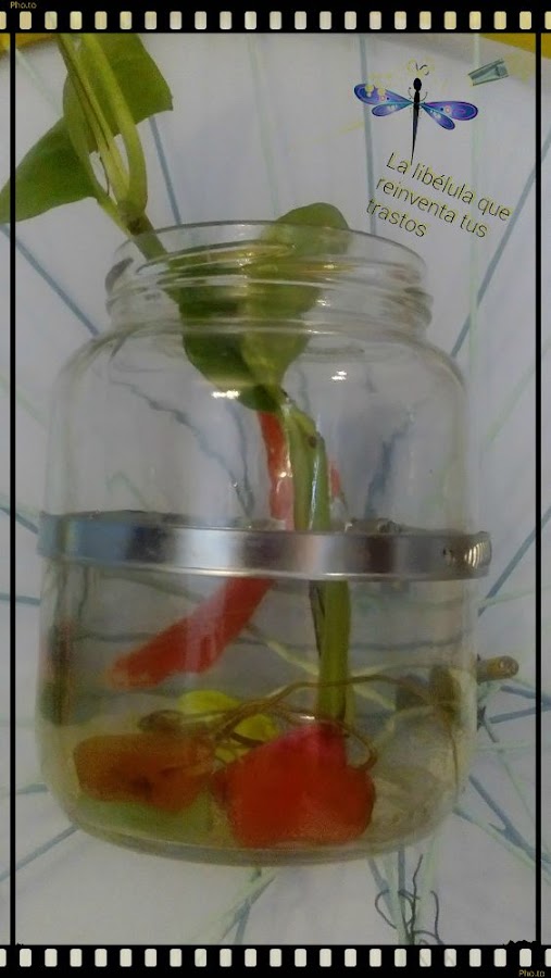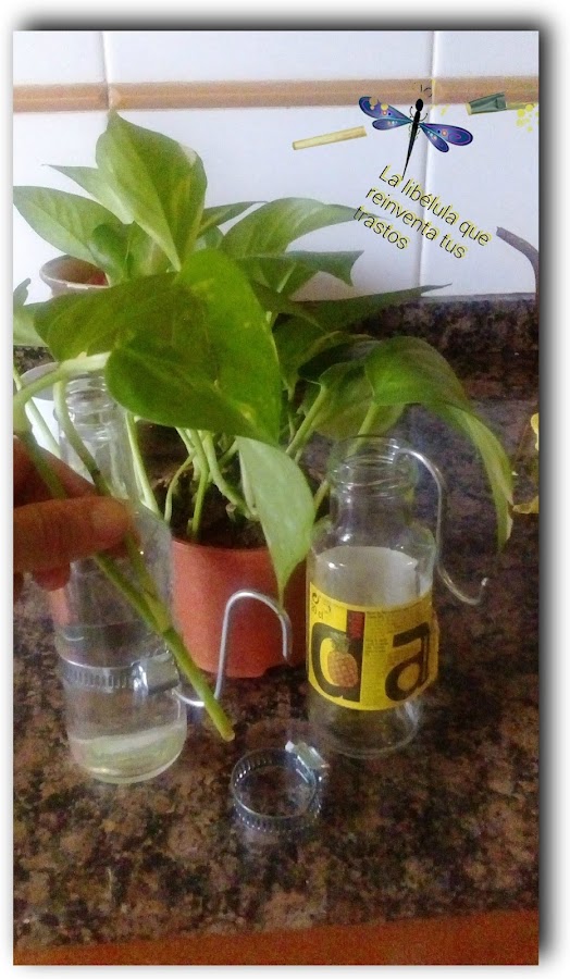 Y luego compré esta plantita de Potos, le corté unas ramas, y simplemente metiéndolas en el agua de unas botella de cristal, van desarrollando sus raíces, es una planta muy lista!! ;)