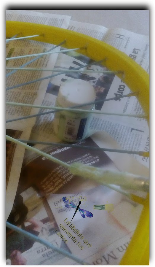 Los botes los cogí con una abrazadera, un gancho, y alguno con trapillo, para poder colgarlos de la rueda.