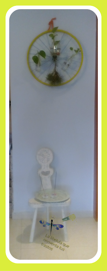 Estamos aún en agosto, y sigo con post un poco refrescantes. Así que hoy os enseño como reciclando una llanta de rueda de bici y unos botes de conserva de crital, he creado un pequeño jardín vertical para el comedor.