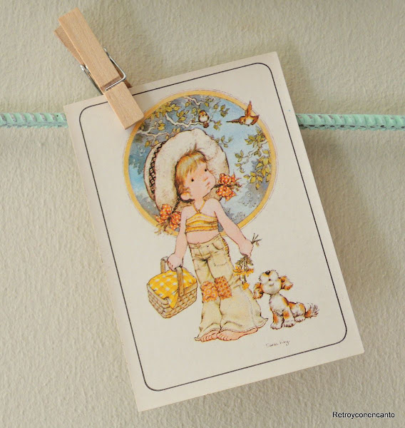 Y sólo nos queda decorarla. Nuestra buena amiga Rocío nos sorprendió con un sobrecito repleto de unas preciosas estampìtas de los años 80 con dibujos de Sarah Kay. Más de una se acordará de ellos, porque sus imágenes solían cubrir nuestras carpetas del colegio, junto con las consabidas fotos de Robert Redford o Paul Newman...