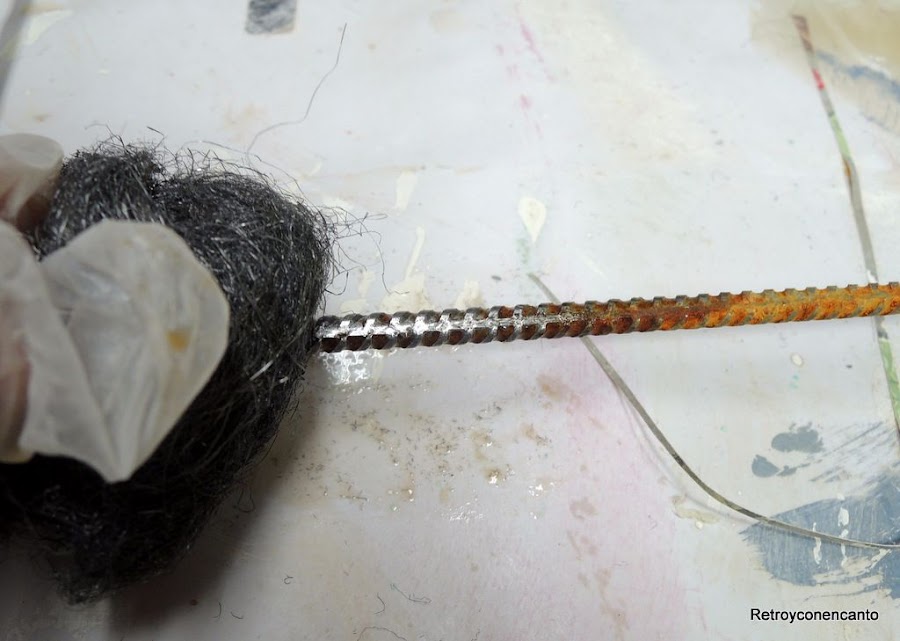Hemos lijado un poquito para que en algunas zonas se entrevea el acero y los restos de óxido más difíciles de quitar, pero que le dan mucho juego, al menos así lo vemos nosotras.