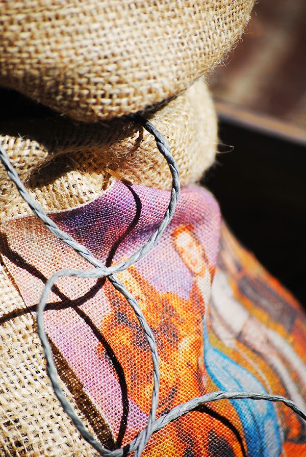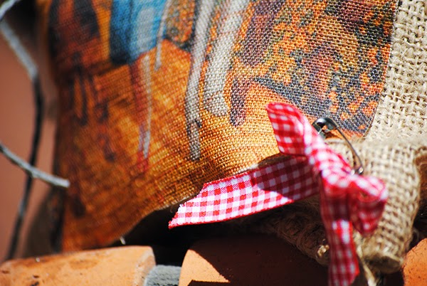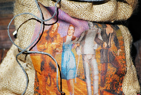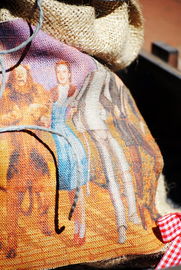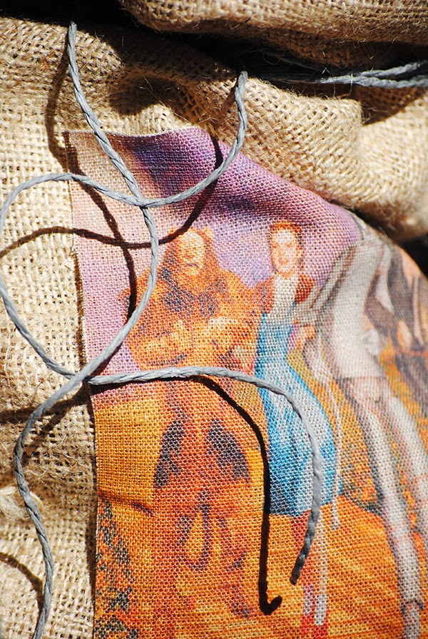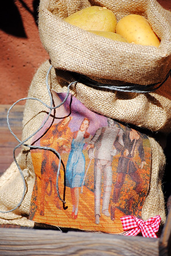 Era un pequeño saco que no tenía ningún uso en concreto. Antes de tirarlo a la basura, le colocamos un trozo de lino con una imagen del Mago de Oz, una cuerda y una lazo... y tenemos un saco para las patatas.