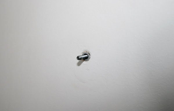 Hacemos un orificio de 5 mm en la pared en el cual meteremos un taco. Aquí enroscaremos, con la ayuda de un alicate, el tornillo que viene con el pomo al cual hemos cortado la cabeza para que se pueda introducir. Yo he optado por comprar uno más largo en la ferretería para mayor seguridad.