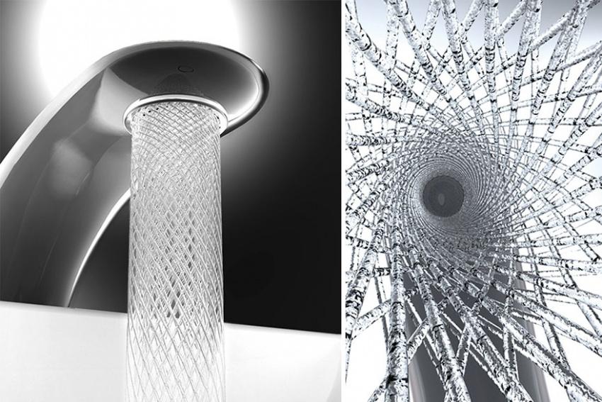 Para ello usó primero el principio de disminuir la cantidad de agua que sale por la llave, lo cual nos hace más racionales. Y en segundo lugar, buscó una manera de que tuviera una estética minimalista en su entorno y en el chorro de agua que sale, formando una preciosa espiral o malla de agua.