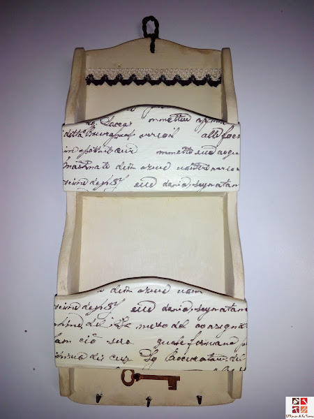 Después y para darle un toque más vintage , le dí un poco de cera con color por los bordes, oscureciendo algunas partes y decoré con una llave de madera adhesiva .