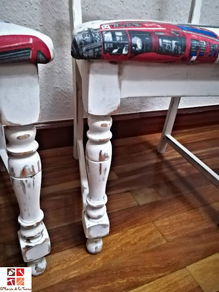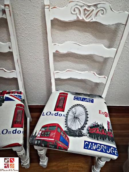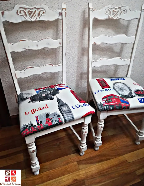 Junto con este escritorio me trajo dos sillas para que las tuneara, las quería blancas decapadas y me enseño una tela que le gustaba, tipo motivos londinenses y así, para que intentase ponerlas con esos motivos, pero que si no la conseguía pusiese otra.