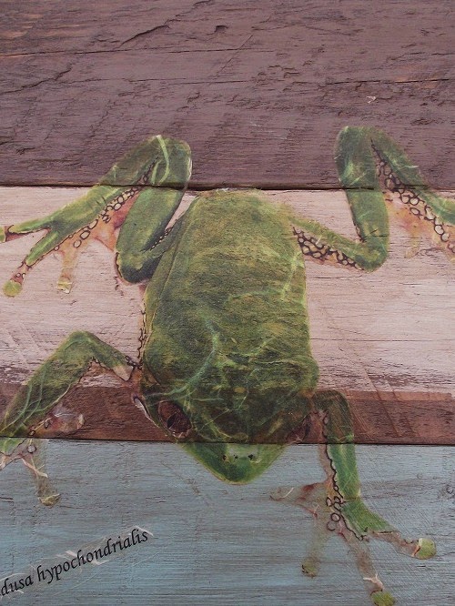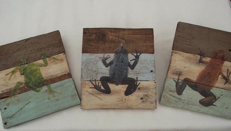 Tres de los cuadros así formados los decoré con un decoupage de ranas de la colección de Global Herp, impresas en papel de arroz. También imprimí los nombres científicos tanto de los animales como de las plantas.