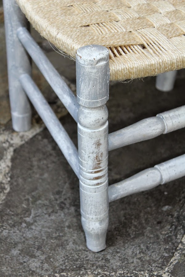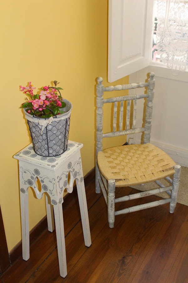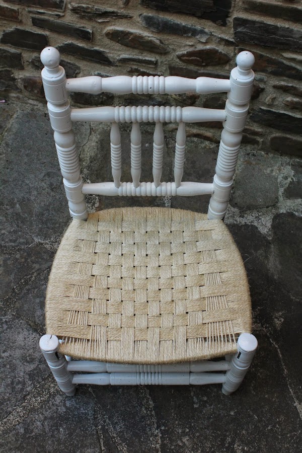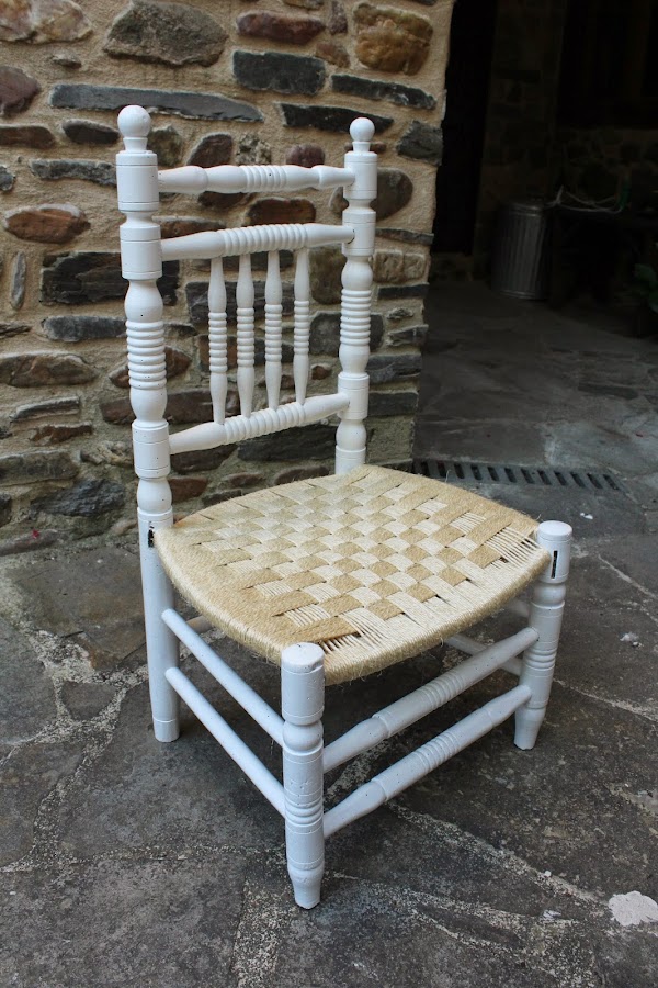 También podréis ver que la silla tenía unas maderitas tapando el borde de la silla (creemos que serían para que la cuerda no se rompiera con el uso) pero nosotros decidimos dejarla así. Tapé los agujeros con masilla y los pinté de blanco.