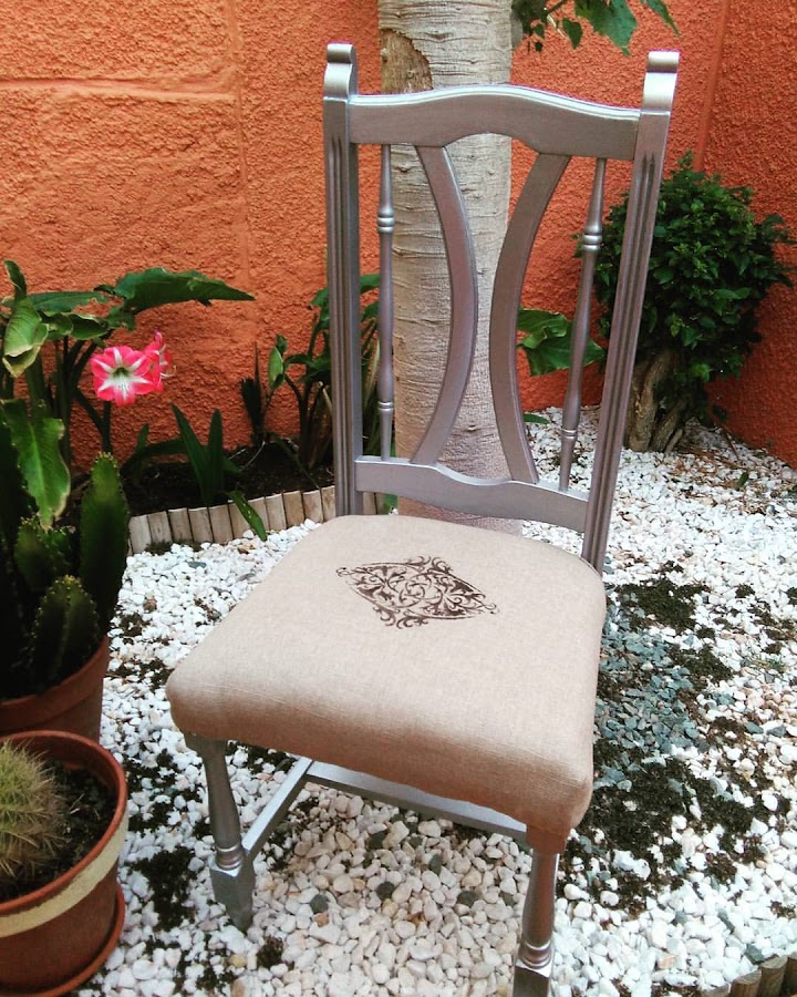 Después de destapizar la silla y limpiarla, le dimos imprimación transparente para que la pintura metalizada tuviera agarre.