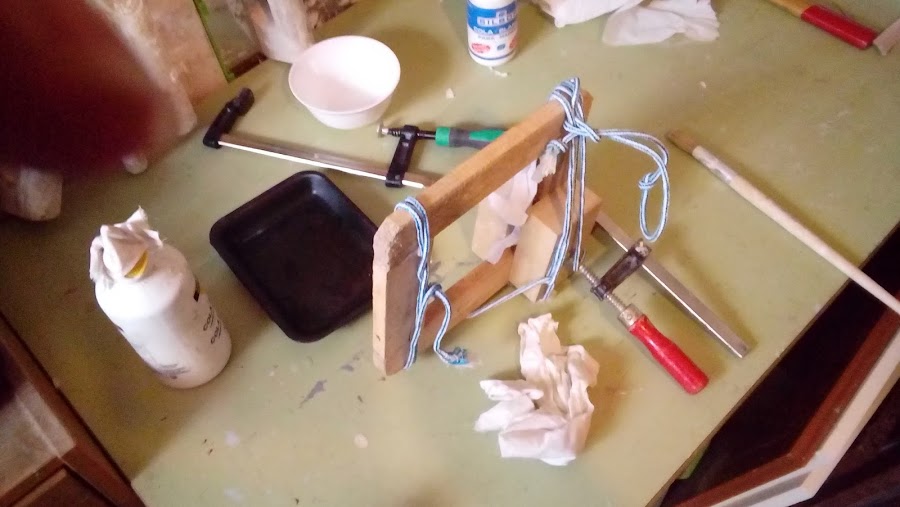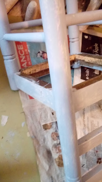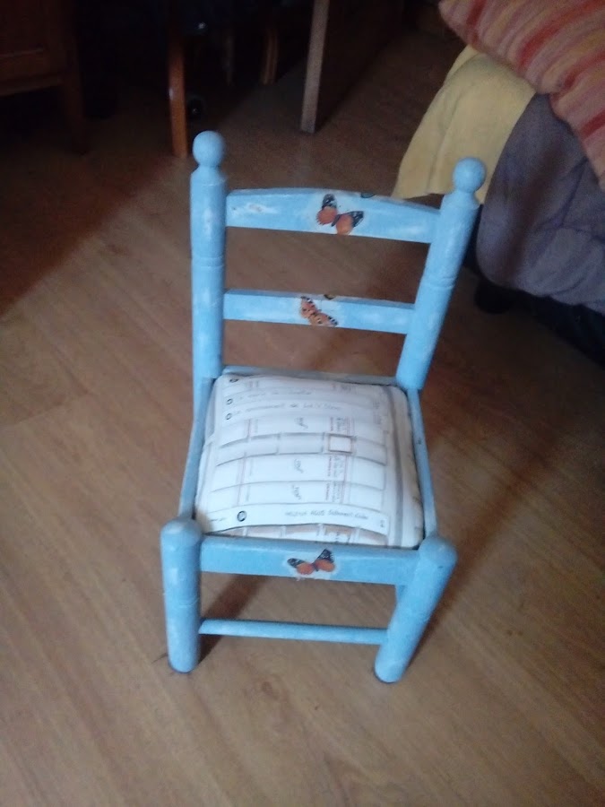 Como veis la estructura de la tapiceria la tuve que encolar y arreglar para retapizar. Los dos colores elegidos fueron blanco de Ibiza de la pajarita y un azul muy claro de Restaura y recupera.