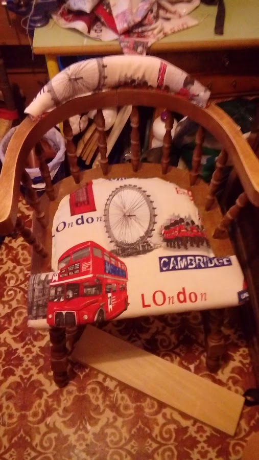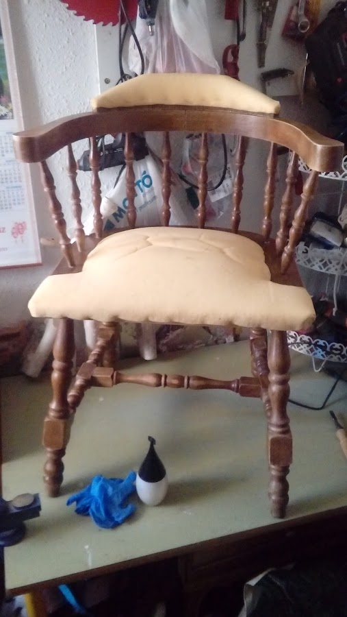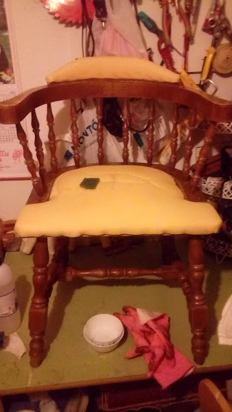 Después paso a limpiar con decapante y ha barnizar con goma laca a muñequilla. Y ha ponerle una tela nueva. La misma de la butaca. Porque tenía un resto.