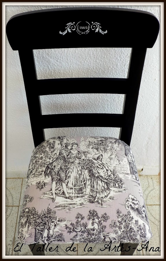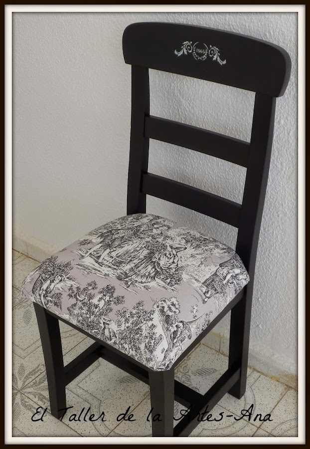 He vuelto a tapizar con un toile de jouy que sabéis que uso mucho porque me encanta. Esta vez es diferente a las anteriores ya que en vez del fondo blanco lo tiene en color. Este es un suave gris y el dibujo en negro. El tapizado es todo nuevo por supuesto.