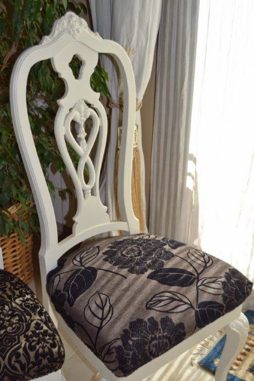 La tela para tapizarlas es espectacular, de distintos dibujos pero con la misma tonalidad cromática. Cada una de ellas es diferente, pero el conjunto es perfecto. Rematadas con tachuelas.